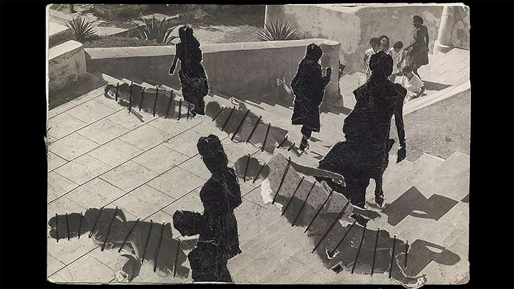 It is on the outside and inside of containers such as suitcases, brass or wooden boxes that Cadi pastes black and white photographs on which he uses a blue pen. Thus, touching family scenes are transformed into grotesque, even satanic images, where the characters are deprived of their faces or characterized by diabolic features such as long ears, horns or claws. Far from addressing the theme of loss of identity, the ripped faces reappear in a macabre way on other parts of the composition. They are then not only glued but literally sewn onto the support.