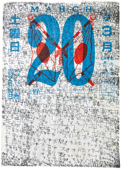 Ainsi, Hideaki Yoshikawa façonne dans l’argile des peuplades hiératiques, là où Yumiko Kawai brode des ombilics qui aspirent le regard dans leurs spirales concentriques ; Yukio Miyashita propage des mots qui lui sont étrangers comme des insectes sur la feuille, tandis que Kunizo Matsumoto anime des pages d’éphémérides avec ces myriades de caractères ; Yuichi Saito sème au gré de la feuille ses nuées d’idéogrammes alors que Masaki Mori déploie des processions sérielles qui rappellent Henri Michaux ; La jeune Momoko Nakagawa passe de la modulation de fréquences colorées à la scansion de chiffres dans des halos de café et Koji Nishioka laisse sa musique intérieure pérégriner sur des portées ondoyantes.